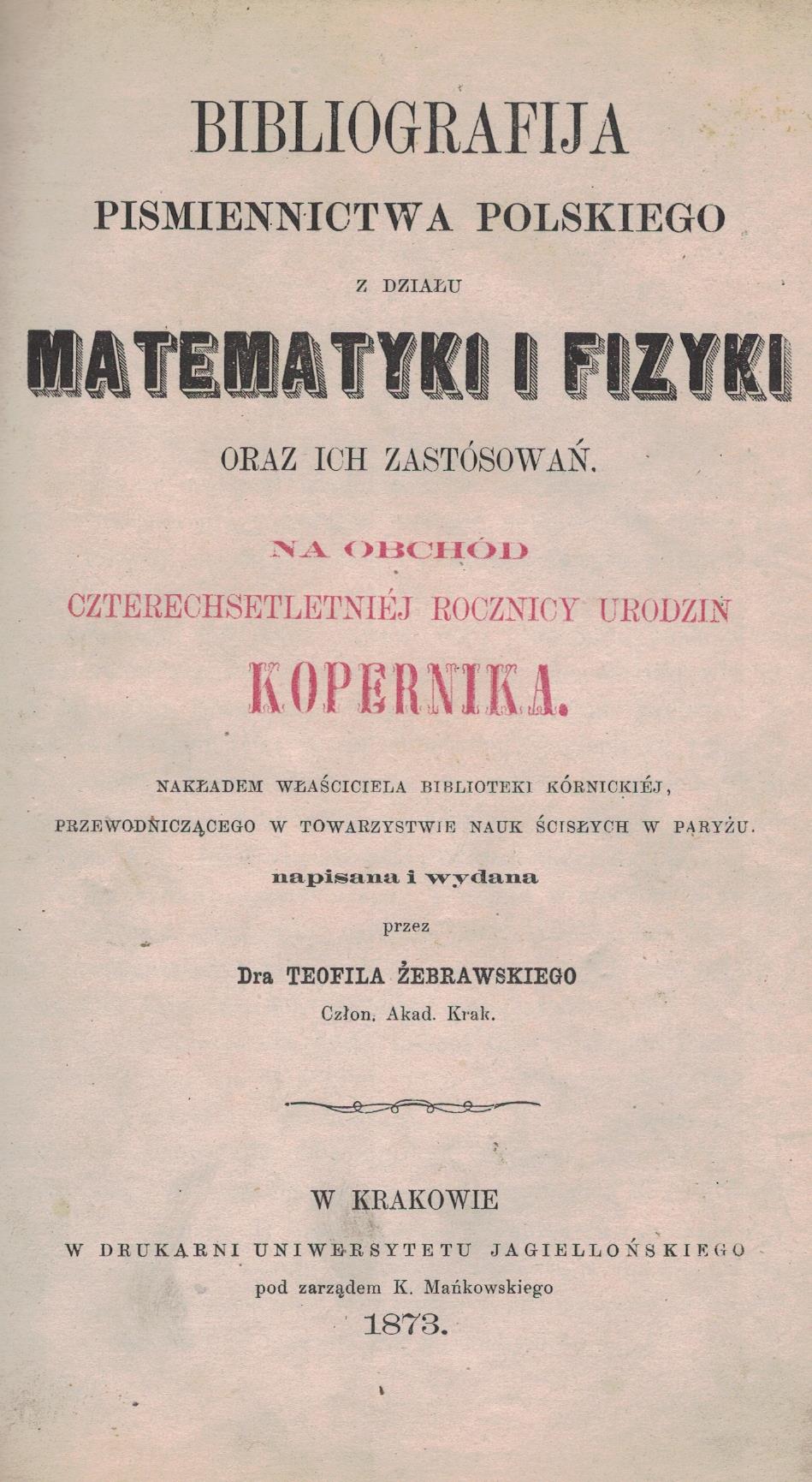 | Inne tytuły: | Dodatki do biblijografii piśmiennictwa polskiego z działu matematyki i fizyki oraz ich zastósowań wydanej w r[oku] 1873 nakładem Biblijoteki Kórnickiej na obchód czterechsetletniéj rocznicy urodzin Kopernika |