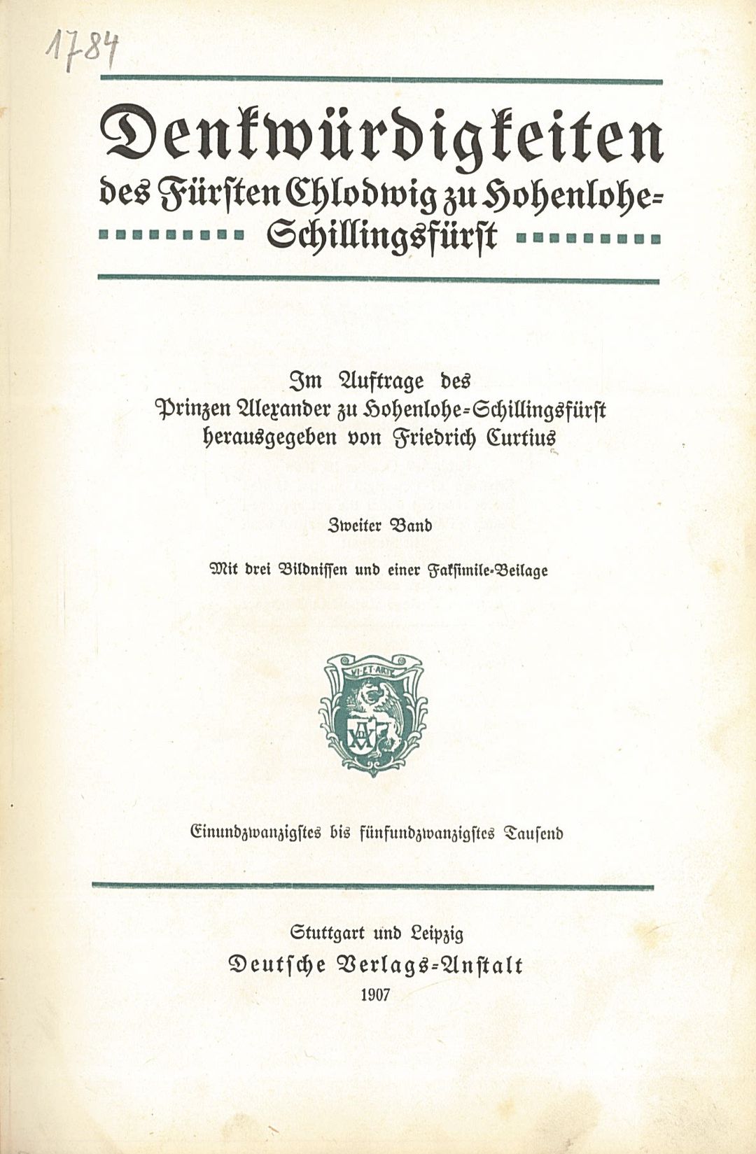 | Inne tytuły: | Denkwürdigkeiten des Fürsten Chlodwig zu Hohenlohe-Schillingsfürst Bd. 2 |