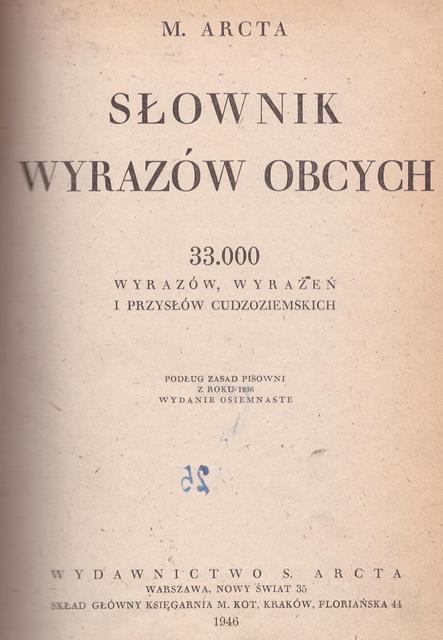| Inne tytuły: | 33.000 wyrazów, wyrażeń i przysłów cudzoziemskich podług zasad pisowni z roku 1936 Michała Arcta słownik wyrazów obcych |