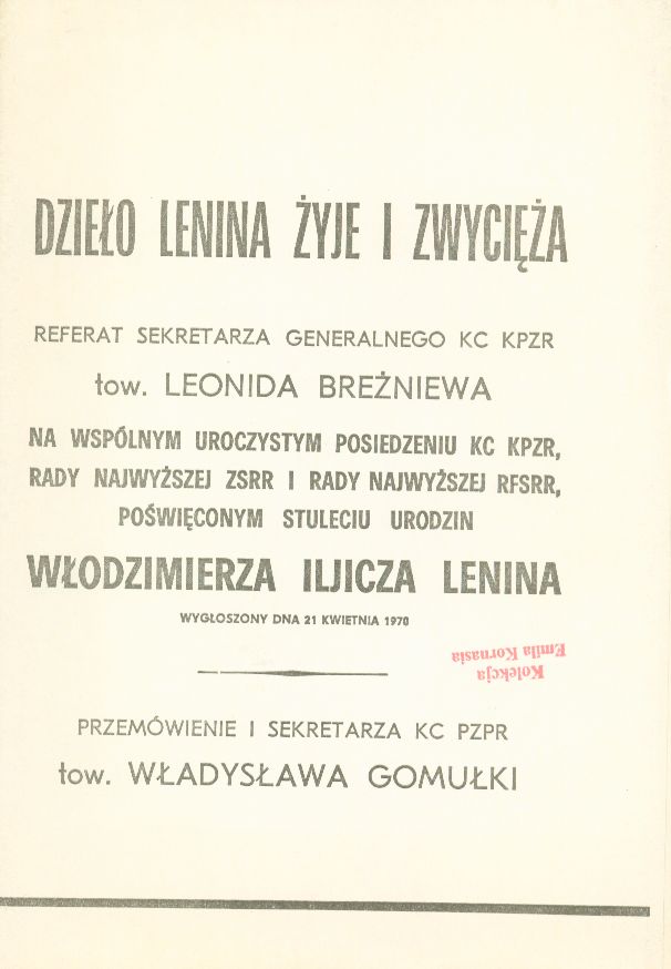 | Inne tytuły: | referat Sekretarza Generalnego KC KPZR tow. Leonida Breżniewa na wspólnym uroczystym posiedzeniu KC KPZR, Rady Najwyższej ZSRR i Rady Najwyższej RFSRR w dniu 21 kwietnia 1970 r. poświęconym setnej rocznicy urodin Włodzimierza Iljicza Lenina. Przemówienie I Sekretarza KC PZPR tow. Władysława Gomułki Przemówienie |