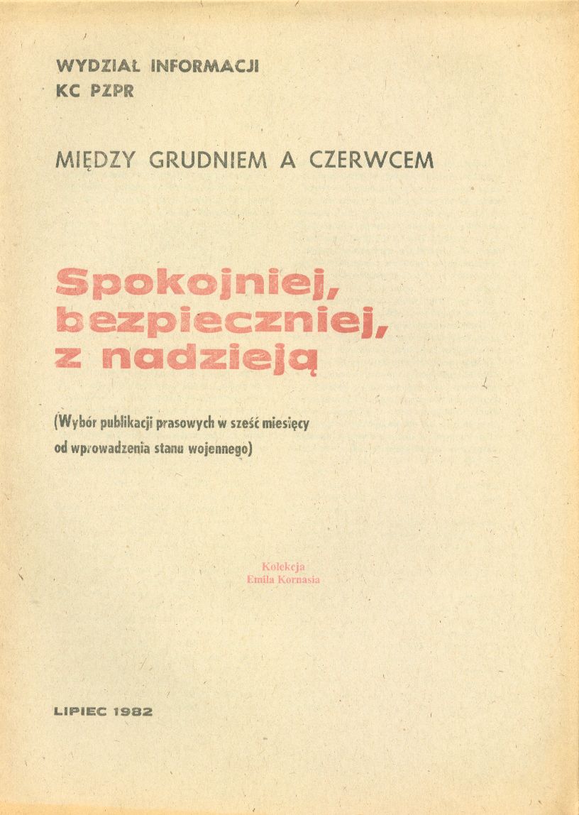 | Inne tytuły: | spokojniej, bezpieczniej, z nadzieją (wybór publikacji prasowych w sześć miesięcy od wprowadzenia stanu wojennego) |