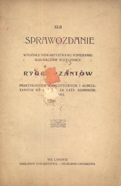 XLII sprawozdanie Wydziału Towarzystwa ku Wspieraniu Słuchaczów Wszechnicy Rygorozantów, Praktykantów Konceptowych i Auskulantów we Lwowie za lata administr. 1910/1911