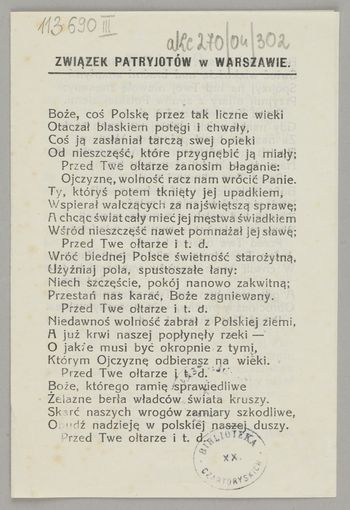 Boże, coś Polskę... Boże, coś Polskę przez tak liczne wieki Otaczał blaskiem potęg i chwały, Coś ją osłaniał tarczą swej opieki Od nieszczęść, które przygnębić ją miały. Przed Twe ołtarze zanosim błaganie: Ojczyznę wolną racz nam wrócić, Panie! Ty, któryś potem tknięty jej upadkiem Wspierał walczących za najświętszą sprawę, A chcąc świat cały mieć jej męstwa świadkiem W nieszczęściach samych pomnażał jej sławę. Przed Twe ołtarze... itd. Niedawnoś wolność zabrał z polskiej ziemi, A łez, krwi naszej popłynęły rzeki, Jakże to musi być okropnie z tymi, Którym ojczyznę odbierasz na wieki. Przed Twe ołtarze... itd. Wróć naszej Polsce świetność starożytną, Użyźnij pola, spustoszałe łany, Niech szczęście, pokój na nowo zakwitną, Przestań nas karać, Boże zagniewany! [...]