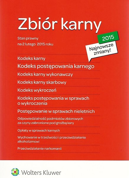 | Inne tytuły: | 2015 Kodeks karny Kodeks karny skarbowy Kodeks karny wykonawczy Kodeks postępowania karnego Kodeks postępowania w sprawach o wykroczenia Kodeks wykroczeń Postępowanie w sprawach nieletnich najnowsze zmiany |