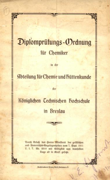 Diplomprüfungs-Ordnung für Chemiker in der Abteilung für Chemie und Hüttenkunde der Königlichen Technischen Hochschule in Breslau