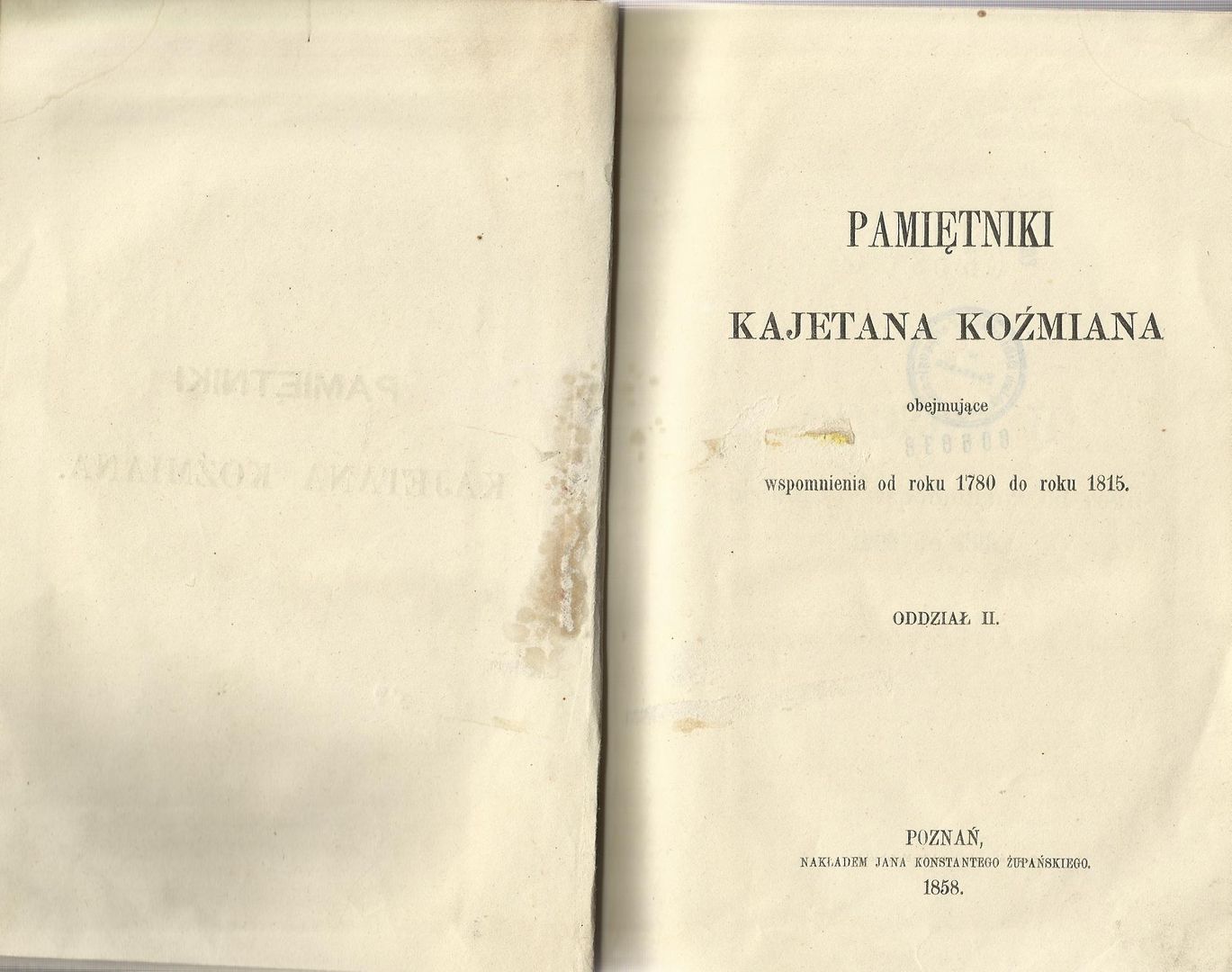 | Inne tytuły: | Pamiętniki Kajetana Koźmiana obejmujące wspomnienia od roku 1780 do roku 1815 Oddz. 2, |