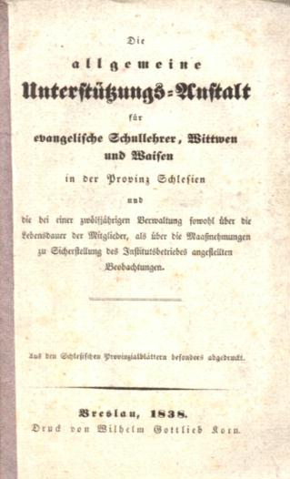 Die allgemeine Unterstützungs=Anstalt für evangelische Schullehrer, Mittwen und Maisen in der Provinz Schlesien ...