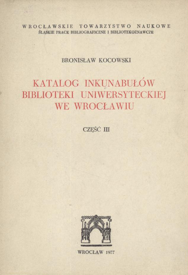 | Inne tytuły: | Katalog inkunabułów Biblioteki Uniwersyteckiej we Wrocławiu Cz. 3, |