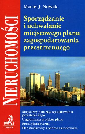 Spis treści : . Procedura sporządzenia miejscowego planu zagospodarowania przestrzennego ; II. Sporządzenie miejscowego planu zagospodarowania przestrzennego a przepisy szczególne (Zrównoważony rozwój w planowaniu i zagospodarowaniu przestrzennym, Ochrona środowiska w ustawie o planowaniu i zagospodarowaniu przestrzennym, Ochrona środowiska w planowaniu przestrzennym w prawie ochrony środowiska, Ochrona przyrody w planowaniu przestrzennym, Sporządzenie MPZP a ocena oddziaływania na środowisko, Strategiczna ocena oddziaływania na środowisko przy sporządzaniu MPZP, Ocena oddziaływania przedsięwzięcia na środowisko - przedsięwzięcia podlegające ocenie, Procedura związana z wydaniem decyzji o środowiskowych uwarunkowaniach, Decyzja o środowiskowych uwarunkowaniach a miejscowe plany zagospodarowania przestrzennego i decyzje lokalizacyjne, Niezgodność przedsięwzięcia z planem miejscowym - analiza wybranych przypadków, Planowanie przestrzenne a zarządzanie drogami, Planowanie przestrzenne w "specustawie drogowej", Plany rozwoju sieci drogowej i zmiana przeznaczenia terenów a plany zagospodarowania przestrzennego, Ograniczenie usytuowania obiektów budowlanych, Planowanie przestrzenne w przypadku inwestycji kolejowych, Zmiana przeznaczenia gruntów rolnych i leśnych, Planowanie przestrzenne a ochrona zabytków) ; III. Zakres miejscowego planu zagospodarowania przestrzennego oraz skutki jego uchwalenia (Zakres MPZP, Ogólne zasady związane z przygotowywaniem poszczególnych elementów planu miejscowego, Określenie przeznaczenia terenu w MPZP, Wyznaczanie dróg w planie miejscowym, Zasady podziału oraz scalenia i podziału nieruchomości zawarte w planie, Plan miejscowy dla jednej działki, Mieszane przeznaczenie dla nieruchomości określone w planie, Konsekwencje uchwalenia i funkcje miejscowego planu zagospodarowania przestrzennego, Finansowe skutki uchwalenia MPZP, Obiekty wielkopowierzchniowe a planowanie przestrzenne) ; IV. Miejscowy plan zagospodarowania przestrzennego a decyzje o warunkach zabudowy i zagospodarowania terenu i pozwolenia na budowę ; V. Wzory pism, uchwał i rozstrzygnięć.