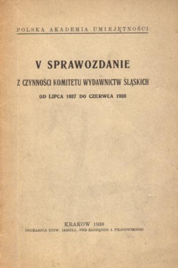 V sprawozdanie z czynności Komitetu Wydawnictw Śląskich od lipca 1937 do czerwca 1938