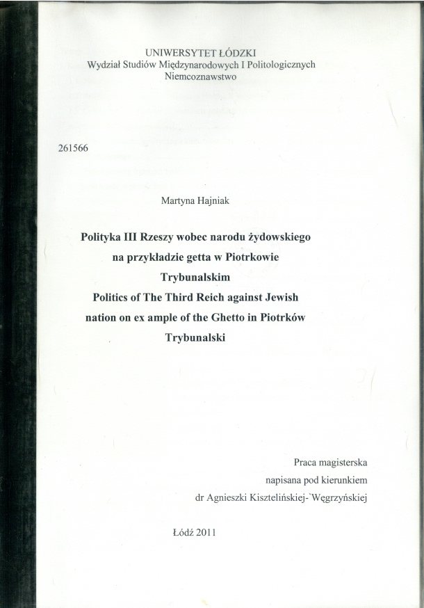 | Inne tytuły: | Politics of the Third Reich against Jewish nation on ex ample [example] of the ghetto Politics of the Third Reich against Jewish nation on ex ample [example] of the ghetto in Piotrków Trybunalski |