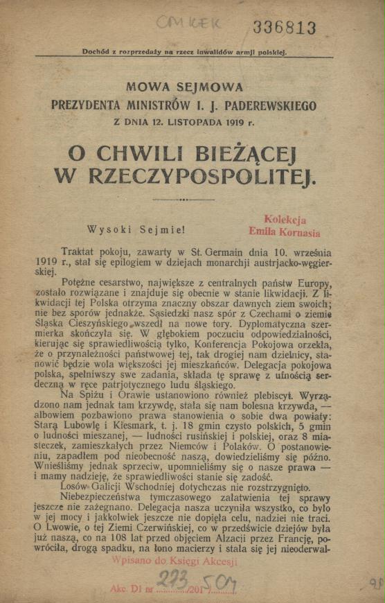 mowa sejmowa prezydenta ministrów I. J. Paderewskiego z dnia 12. listopada 1919 r