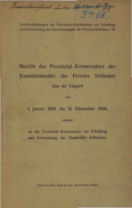 Bericht des Provinzial-Konservators der Kunstdenkmäler der Provinz Schlesien über die Tätigkeit vom 1 . Januar 1905 bis 31. Dezember 1906 erstattet an die Provinzial-Kommission zur Erhaltung und Erforschung der Denkmäler Schlesien