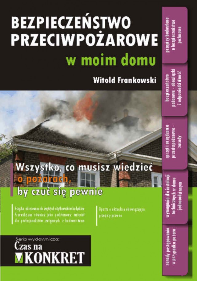 Treść : Dane statystyczne dotyczące interwencji jednostek ochrony przeciwpożarowej w 2009 i 1010 r., Charakterystyczne pożary w budynkach mieszkalnych, Przyczyny powstania pożarów w Polsce w 2009 r., 1: Pojęcie ochrony przeciwpożarowej, 2: Obowiązek zapewnienia bezpieczeństwa przeciwpożarowego, 3: Proces palenia i zjawiska mu towarzyszące. Pożar, 4: Przyczyny powstawania pożarów, 5: Przyczyny rozprzestrzeniania się pożarów, 6: Podstawowe przepisy prawne, 7: Pojęcia podstawowe z zakresu budownictwa, 8: Charakterystyka zabudowy jednorodzinnej, 9: Wyposażenie techniczne budynków (Instalacje grzewcze, Instalacje kominowe, Instalacja gazowa na paliwa gazowe, Instalacja elektryczna, Instalacje odgromowe i uziemiające), 10: Instalacje wentylacyjne (Przewody wentylacyjne, Wentylacja oddymiająca), 11: Charakterystyka obiektów pod względem pożarowym, (Podział budynków ze względu na wysokość, przeznaczenie i sposób użytkowania, Odporność pożarowa budynków, Strefy pożarowe, Sytuowanie budynków, Instalacja wodociągowa przeciwpożarowa, Zaopatrzenie w wodę do zewnętrznego gaszenia pożaru, Wymagania dla garaży, Drogi pożarowe, Wejścia do budynków i mieszkań, Schody i pochylnie, Uzgadnianie projektu budowlanego), 12: Dokonywanie podziału nieruchomości, 13: Czynności zabronione i obowiązki w zakresie ochrony przeciwpożarowej, 14: Środki gaśnicze, gaśnice, urządzenia gaśnicze, 15: Sygnalizacja pożarowa, wykrywanie niebezpiecznych stężeń, 16: Utrzymanie budynków zabudowy jednorodzinnej, 17: Postępowanie na wypadek pożaru, 18: Ewakuacja z budynku w przypadku pożaru.