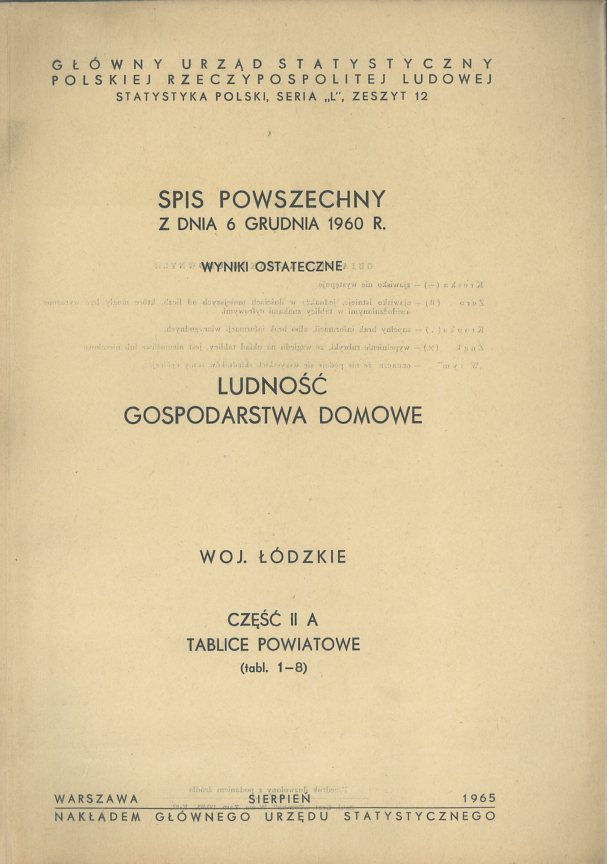 | Inne tytuły: | ludność, gospodarstwa domowe woj. łódzkie wyniki ostateczne Spis powszechny z dnia 6 grudnia 1960 r. Cz. 2A, |