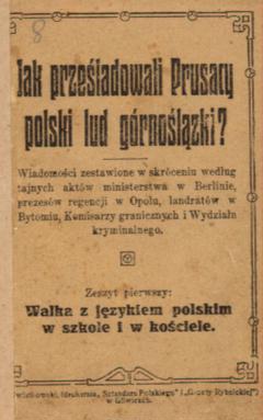 | Inne tytuły: | Walka z językiem polskim w szkole i w kościele wiadomości zestawione w skróceniu według tajnych aktów ministerstwa w Berlinie, prezesów regencji w Opolu, landratów w Bytomiu, Komisarzy granicznych i Wydziału kryminalnego Jak prześladowali Prusacy polski lud na Górnym Ślązku? Z. 1. |