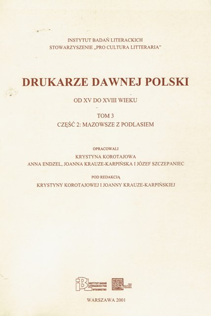 | Inne tytuły: | Mazowsze z Podlasiem Drukarze dawnej Polski od XV do XVIII wieku T. 3. |
