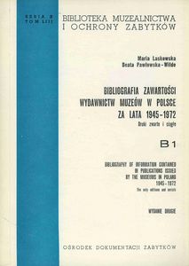 | Inne tytuły: | druki zwarte i ciągłe Bibliography of information contained in publications issued by the museums in Poland 1945-1972 |