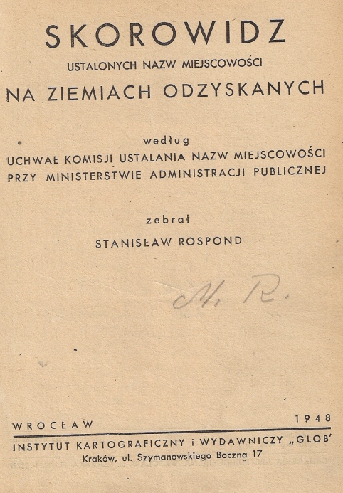 Skorowidz ustalonych nazw miejscowości na Ziemiach Odzyskanych według uchwał Komisji Ustalania Nazw Miejscowości przy Ministerstwie Administracji Publicznej: