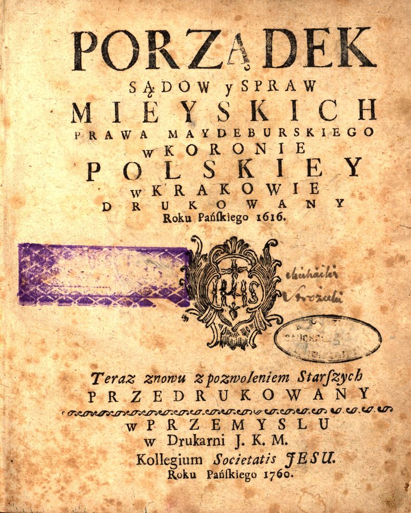 | Inne tytuły: | Porządek sądów y spraw mieyskich prawa maydeburskiego w Koronie Polskiey... |