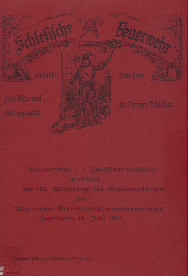 | Inne tytuły: | Erinnerungs - Jubiläumsbroschüre anlässlich der 125. Wiederkehr des Gründungstages des "Schlesischen Provinzial - Feuerwehrverbandes" gegründet: 19. Juli 1863 Feuerlösch- und Rettungswesen der Provinz Schlesien |
