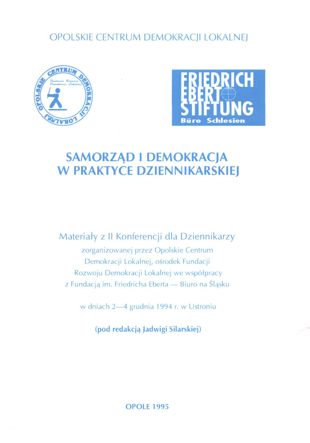 materiały z II konferencji dla dziennikarzy zorganizowanej przez Opolskie Centrum Demokracji Lokalnej, Ośrodek Fundacji Rozwoju Demokracji Lokalnej we współpracy z Fundacją im. Friedricha Eberta - Biuro na Śląsku w dniach 2-4 grudnia 1994 r. w Ustroniu