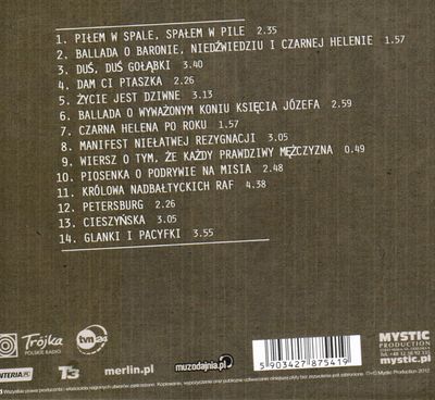 | Inne tytuły: | Ballada o wyważonym koniu księcia Józefa Cieszyńska Czarna Helena po roku Dam ci ptaszka Duś, duś gołąbki Glanki i pacyfki Królowa nadbałtyckich raf Manifest niełatwej rezygnacji Petersburg Piosenka o podrywie na misia Piłem w Spale, spałem w Pile Wiersz o tym, że każdy prawdziwy mężczyzna Życie jest dziwne Niedźwiedziu i Czarnej Helenie Ballada o Baronie |