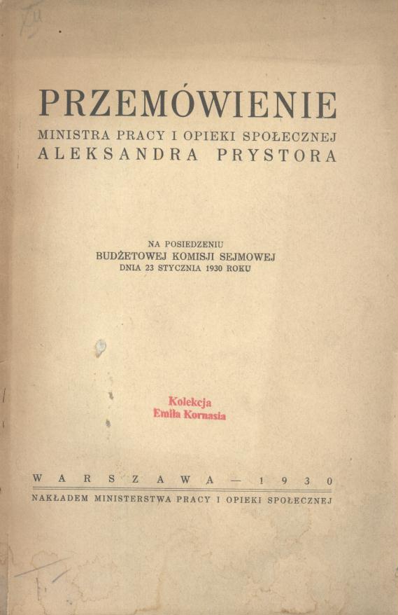 Przemówienie ministra Pracy i Opieki Społecznej Aleksandra Prystora na posiedzeniu Budżetowej Komisji Sejmowej dnia 23 stycznia 1930 roku