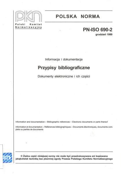 | Inne tytuły: | PN-ISO 690-2 dokumenty elektroniczne i ich części |