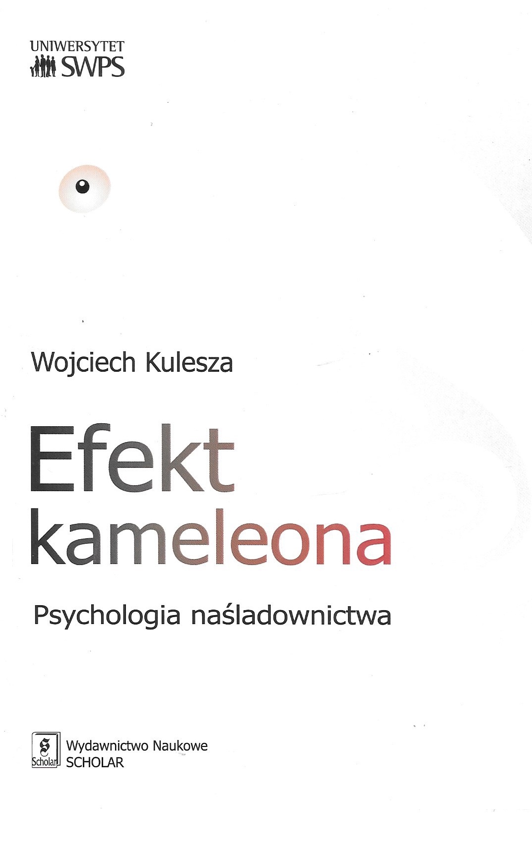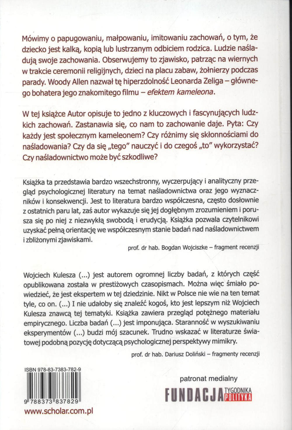 Mówimy o papugowaniu, małpowaniu, imitowaniu zachowań, o tym, że dziecko jest kalką, kopią lub lustrzanym odbiciem rodzica. Ludzie naśladują swoje zachowania. Obserwujemy to zjawisko, patrząc na wiernych w trakcie ceremonii religijnych, dzieci na placu zabaw, żołnierzy podczas parady. Woody Allen nazwał tę hiperzdolność Leonarda Zeliga – głównego bohatera jego znakomitego filmu – efektem kameleona. W tej książce Autor opisuje to jedno z kluczowych i fascynujących ludzkich zachowań. Zastanawia się, co nam to zachowanie daje. Pyta: Czy każdy jest społecznym kameleonem? Czy różnimy się skłonnościami do naśladowania? Czy da się „tego” nauczyć i do czegoś „to” wykorzystać? Czy naśladownictwo może być szkodliwe? Książka ta przedstawia bardzo wszechstronny, wyczerpujący i analityczny przegląd psychologicznej literatury na temat naśladownictwa oraz jego wyznaczniko´w i konsekwencji. Jest to literatura bardzo współczesna, często dosłownie z ostatnich paru lat, zaś autor wykazuje się jej dogłębnym zrozumieniem i porusza się po niej z niezwykłą swobodą i erudycją. Książka pozwala czytelnikowi uzyskać pełną orientację we współczesnym stanie badań nad naśladownictwem i zbliżonymi zjawiskami. prof. dr hab. Bogdan Wojciszke – fragment recenzji Wojciech Kulesza (...) jest autorem ogromnej liczby badań, z których część opublikowana została w prestiżowych czasopismach. Można więc śmiało powiedzieć, że jest ekspertem w tej dziedzinie. Nikt w Polsce nie wie na ten temat tyle, co on. (...) I nie udałoby się znaleźć kogoś, kto jest lepszym niż Wojciech Kulesza znawcą tej tematyki. Książka zawiera przegląd potężnego materiału empirycznego. Liczba badań (...) jest imponująca. Staranność w wyszukiwaniu eksperymentów (...) budzi mój szacunek. Trudno wskazać w literaturze światowej podobną pozycję dotyczącą psychologicznej perspektywy mimikry. prof. dr hab. Dariusz Doliński – fragmenty recenzji Wojciech Kulesza jest wybitnym naukowcem i autorem kilku nowatorskich prac na temat wpływu naśladownictwa na ludzkie zachowanie i decyzje. Poczynione w ostatnich latach postępy w tej dziedzinie mają bez wątpienia związek z jego pracami. Drugą zaletą Wojciecha Kuleszy jest zainteresowanie badaniami terenowymi. Takie podejście w psychologii społecznej jest nadal zbyt rzadkie. prof. Nicolas Gueguen Wojciech Kulesza jest międzynarodowej klasy specjalistą w dziedzinie naśladownictwa i jednym z niewielu badaczy, którzy wnoszą do tej tematyki coś nowego. Jego badania odpowiadają na fundamentalne pytania o filary mimikry i sprytnie pokazują, jak mimikra sprawdza się w życiu. Wojciech nie „naśladuje” starszych badań nad naśladownictwem – twórczo je rozwija. prof. Rick van Baaren Prace Wojciecha Kuleszy na temat mimikry i naśladownictwa wzbogaciły naszą wiedzę na temat okoliczności, w których ludzie skutecznie tego rodzaju techniki stosują. Jego badania pokazują, że takie czynniki, jak świadomość tego, że jest się naśladowanym, atrakcyjność osoby naśladowanej znacząco wpływają na skutki mimikry. Bez jego prac w tym obszarze psychologii wiedzielibyśmy znacznie mniej o mimikrze i naśladownictwie. prof. Scott Wiltermuth Dr Kulesza, wykorzystując swą pokaźną wiedzę z zakresu mimikry, prowadzi fascynujące badania na temat relacji pomiędzy naśladownictwem, atrakcyjnością fizyczną i zachowaniami prospołecznymi. prof. Tania Chartrand twórczyni efektu kameleona Wojciech Kulesza (ur. 1978) – doktor psychologii, pełni funkcję p.o. kierownika Katedry Psychologii Społecznej i Międzykulturowej na Uniwersytecie SWPS Wydział Zamiejscowy w Poznaniu. Autor wielu artykułów dotyczących efektu kameleona opublikowanych w polskich i międzynarodowych czasopismach. Stypendysta tygodnika Polityka. W latach 2012–2013 przebywał na Florida Atlantic University (USA). W latach 2010–2013 związany z Ministerstwem Nauki i Szkolnictwa Wyższego.