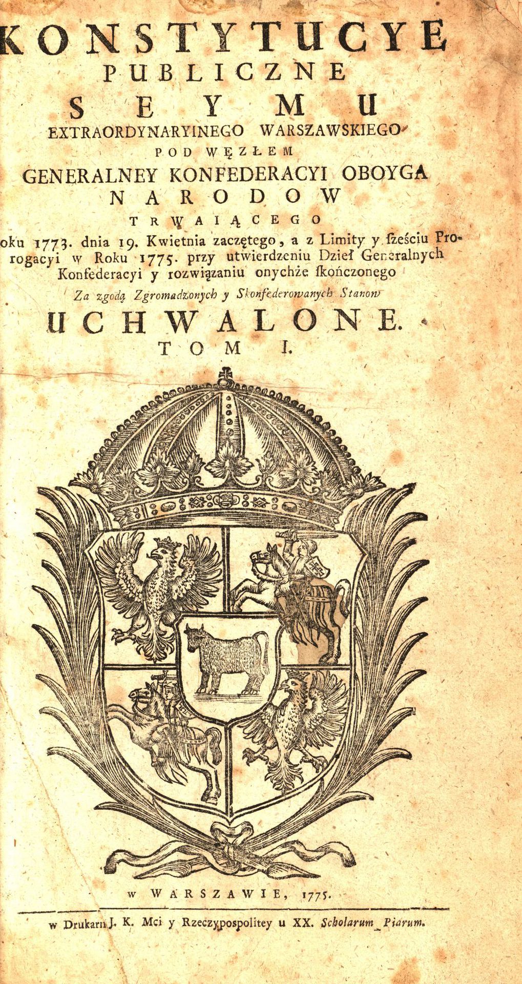 Konstytucye Publiczne Seymu Extraordynaryinego Warszawskiego Pod Węzłem Generalney Konfederacyi Oboyga Narodow Trwaiącego Roku 1773. Dnia 19. Kwietnia zaczętego, a z Limity y sześciu Prorogacyi w Roku 1775. przy utwierdzeniu Dzieł Generalnych Konfederacyi y rozwiązaniu onychże skończonego Za zgodą Zgromadzonych y Skonfederowanych Stanow Uchwalone. Tom 1...