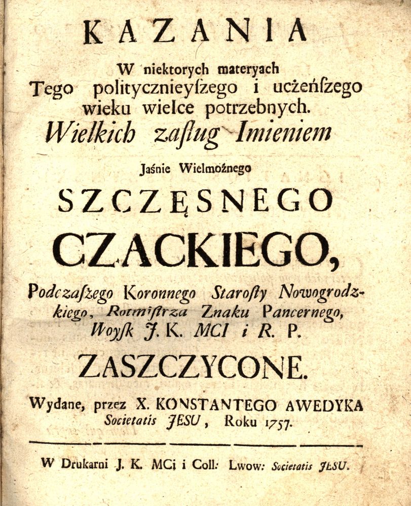 Kazania w niektórych materyach tego politycznieyszego i uczeńszego wieku wielce potrzebnych. Wielkich zasług imieniem JW. Szczęsnego Czackiego, podczaszego koronnego, starosty Nowogrodzkiego, rotmistrza znaku pancernego woysk J. K. Mci i R. P. zaszczycone