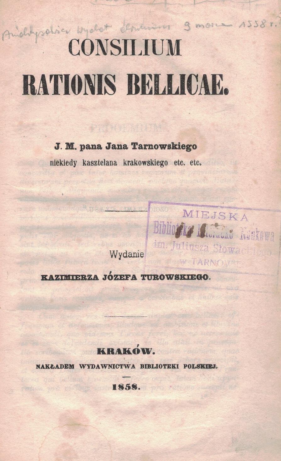 | Inne tytuły: | De bello cum iuratissimis Christianae fidei hostibus Turcis gerendo De laudibus Joannis Tarnovii, castellani cracoviensis et summi in Polonia belli ducis oratio |