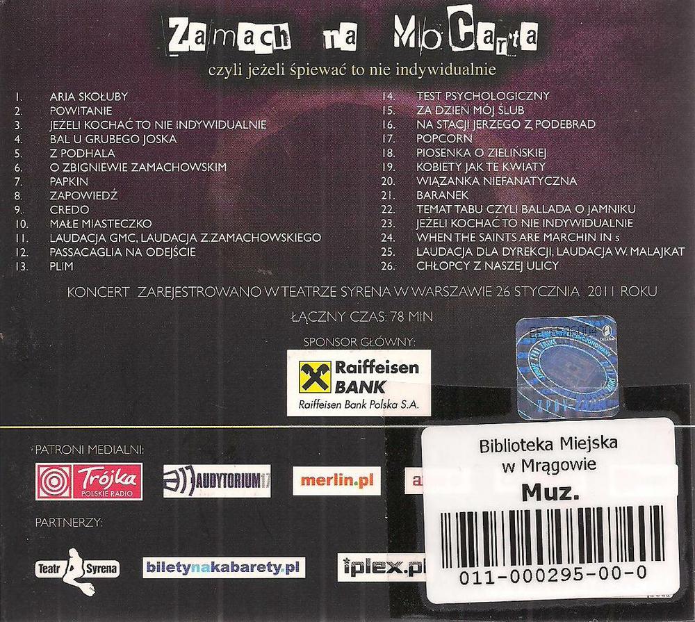 | Inne tytuły: | Jeżeli kochać to nie indywidualnie Aria Skołuby Bal u Grubego Joska Baranek Chłopcy z naszej ulicy Credo Kobiety jak te kwiaty Laudacja GMC, Laudacja Z. Zamachowskiego Laudacja dla Dyrekcji, Laudacja W. Malajkat Małe miasteczko Na stacji Jerzego z Podebrad O Zbigniewie Zamachowskim Papkin Passacaglia na odejście Piosenka o Zielińskiej Plim Popcorn Powitanie Temat Tabu czyli Ballada o Jamniku Test psychologiczny When The Saints Are Marchin In Wiązanka niefanatyczna Z Podhala Za dzień mój ślub Zapowiedź |