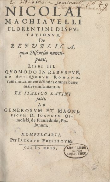 Nicolai Machiavelli Florentini Dispvtationvm de republica, quas discursus nuncupavit, libri III, quomodo in rebvspub. ad antiqvorvm Romanorum imitationem actiones omnes bene maleve instituantur, ex Italico Latini facti, ad generosvm et magnificvm d. Ioannem Osmolski de Prauiedniki Polonum