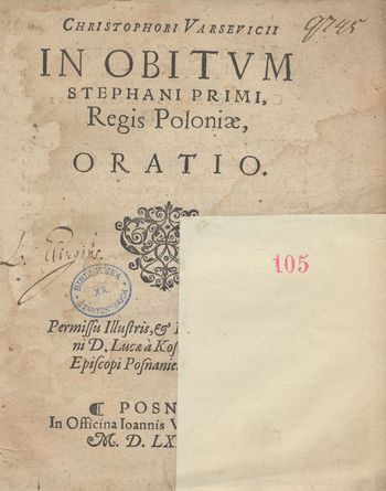 Christophori Varsevicii In Obitvm Stephani Primi, Regis Poloniæ, Oratio