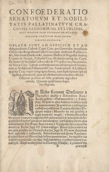 Confoederatio senatorvm et nobilitatis pallatinatvvm Cracovien[sis] Sandomierien[sis] et Lvblinen[sis] post mortem olim Stephani primi regis Poloniae, Cracoviae modo infrascripto ordinata. Oblatae svnt ad officivm et ad acta praesentia castren[si] capit. Crac. per generos. Stanislaum Olszowski [...] My Rady Koronne Duchowne y Swieckie: