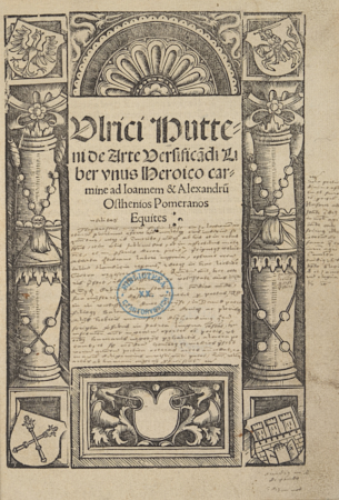 Ulrici Hutteni De arte versifica[n]di liber vnus heroico carmine ad Ioannem Alexandru[m] Osthenios Pomeranos equites