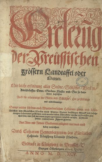 | Inne tytuły: | Erclerung der Preüssischen grössern Landtaffel oder Mappen Mit leicht erfindung aller Stedte, Schlösser, Electen, Kirchdörffer, Orter, Ströme fliesser vnd See so darinnen begriffen [...] Durch Casparum Hennenbergerum [...] Mit leicht erfindung aller Stedte, Schlösser, Flecken, Kirchdörffer, Orter, Ströme, Fliesser vnd See so darinnen begriffen. Auch die erbawunge der Stedte und Schlösser, ihre zerstörunge vnd widerbawunge. Sampt vielen schönen auch Wunderbarlichen Historien [...]. Auch mit feinen contrafeiten Figuren gezieret. Aus Alten vnd Newen Scribenten colligiret, wie dann auch dabey verzeichnet Der See Ströme und Flüsser Namen Welche in der Preuschen Mappen verzeichnet sind und wie solche auf fürgevende weis leichtlich zu finden sein See Ströme und Flüsser Namen, welche in der Preuschen Mappen verzeichnet sind und wie solche auff fürgehende weis leichtlich zu finden sein |