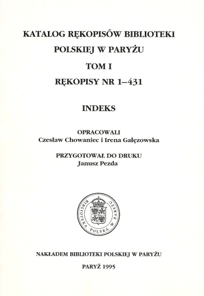 | Inne tytuły: | Katalog rękopisów Biblioteki Polskiej w Paryżu T. 1, |