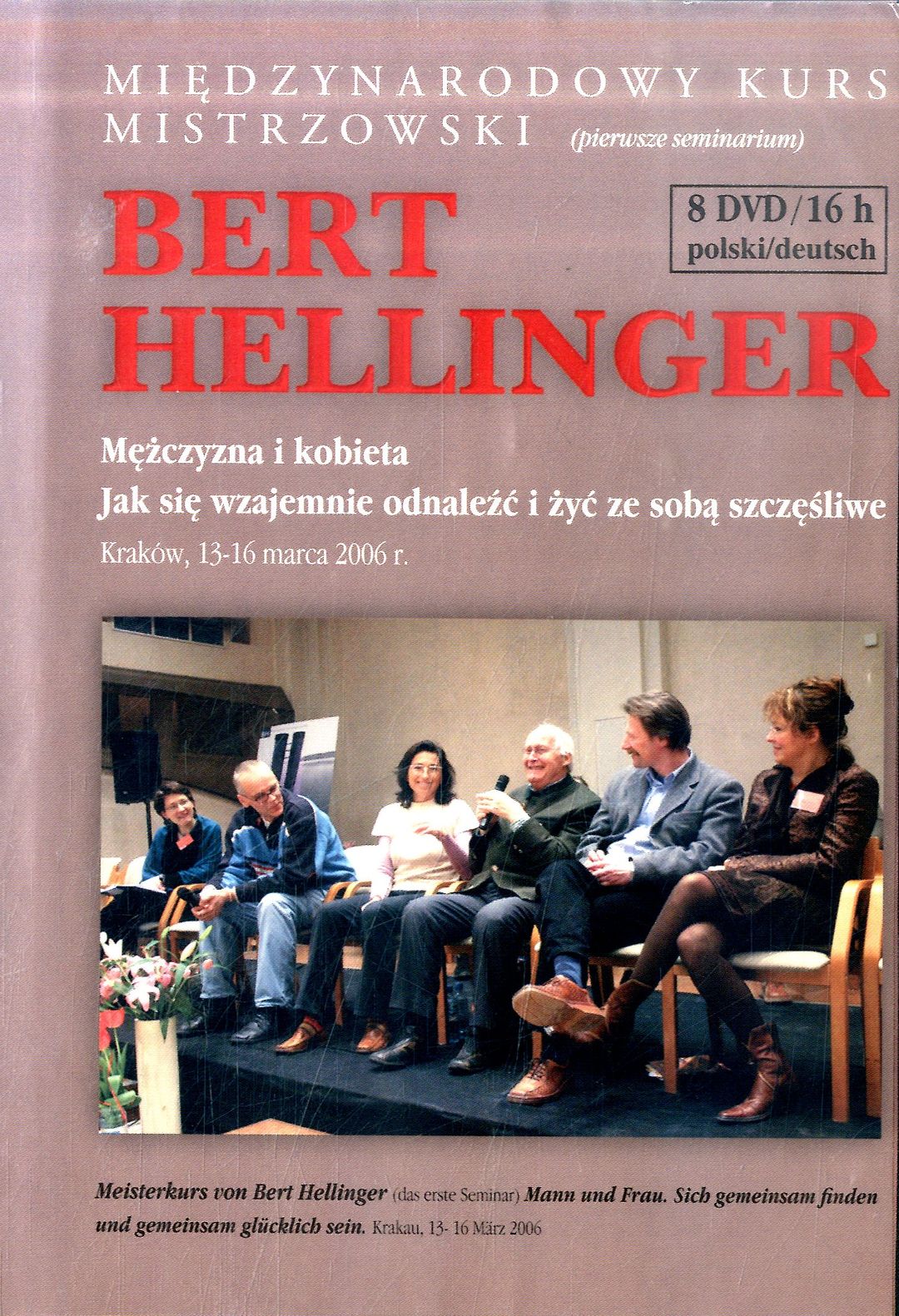 | Inne tytuły: | Kraków, 13-16 marca 2006 r Mężczyzna i kobieta jak się wzajemnie odnaleźć i żyć ze sobą szczęśliwie Krakau, 13-16 März 2006 Mann und Frau Meisterkurs von Bert Hellinger Meisterkurs von Bert Hellinger Der erste Seminar, Międzynarodowy Kurs Mistrzowski Seminarium pierwsze, Sich gemeinsam finden und gemeinsam glücklich sein |