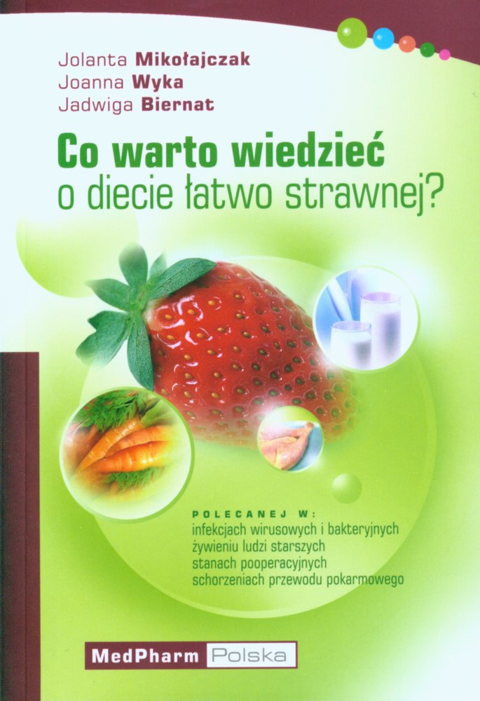 | Inne tytuły: | polecanej w: okresie po zabiegach operacyjnych, chorobach infekcyjnych i bakteryjnych, zaburzeniach układu pokarmowego, żywieniu osób starszych Co warto wiedzieć o diecie łatwo strawnej? |