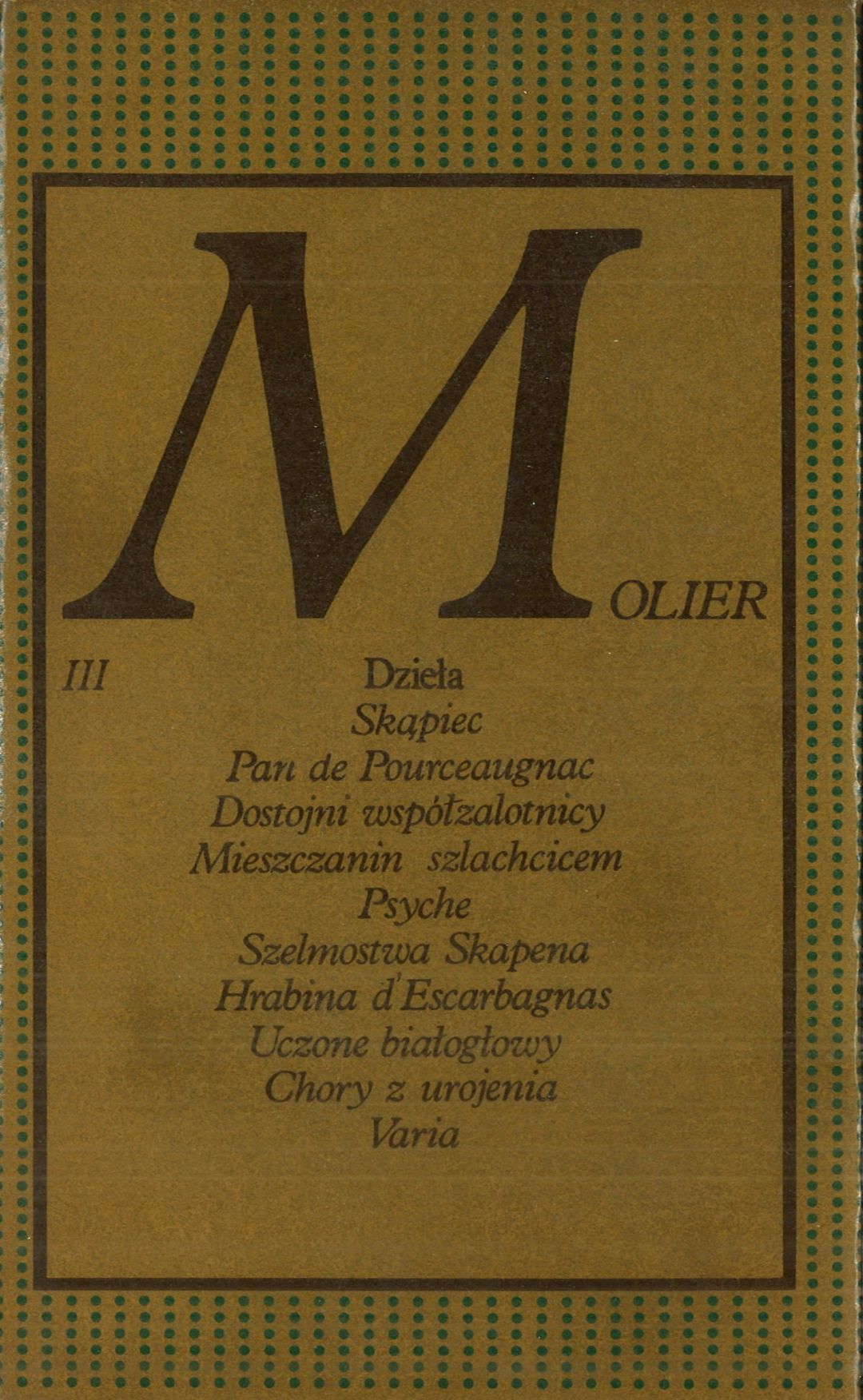 | Inne tytuły: | Chory z urojenia Dostojni współzalotnicy Hrabina d'Escarbagnas Mieszczanin szlachcicem Pan de Pourceaugnac Psyche Szelmostwa Skapena Uczone białogłowy Varia Szata weselna |
