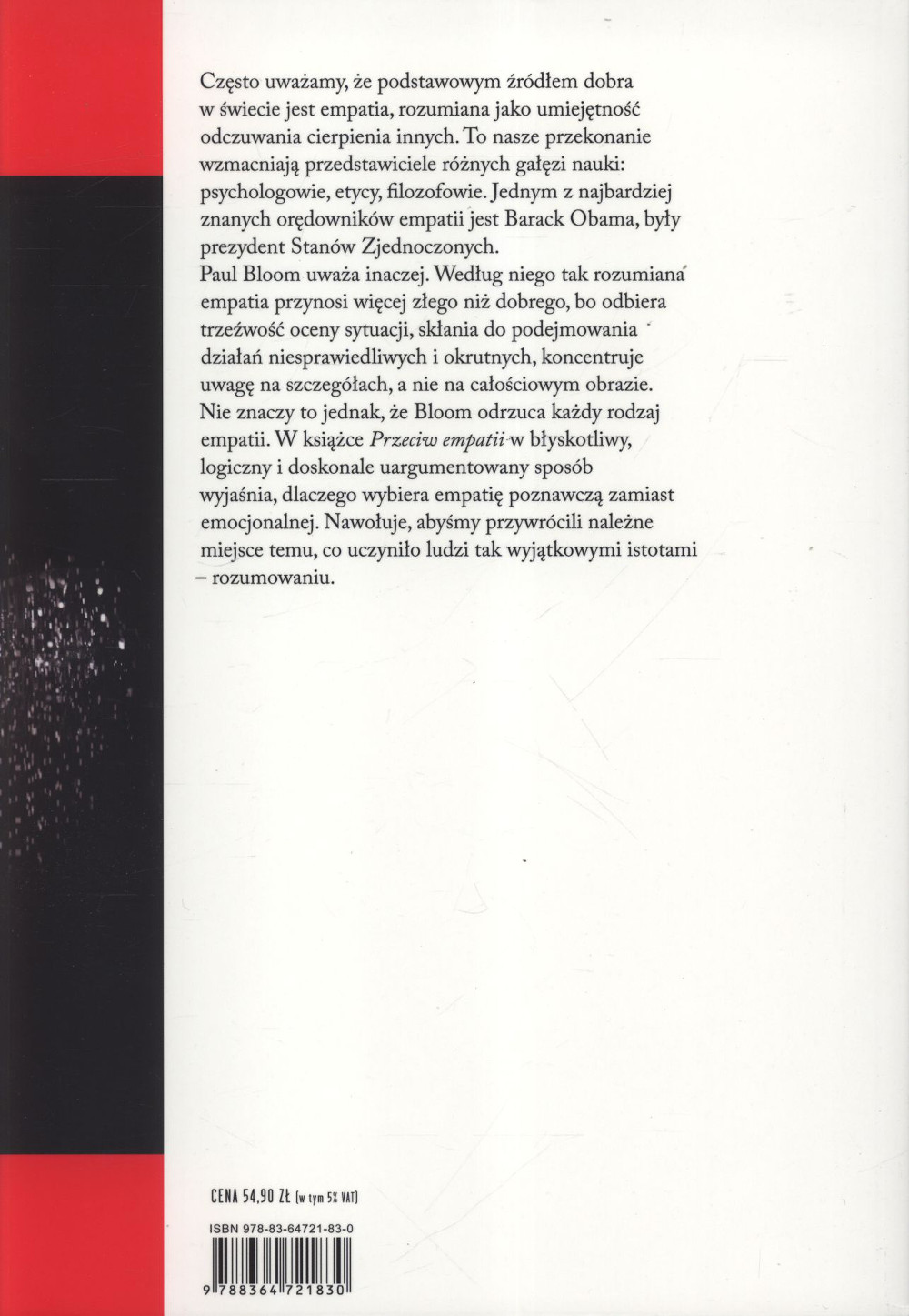 "To, że ludziom na czymś bardzo zależy, że są emocjonalnie poruszeni, nie wiąże się automatycznie z tym, że czynią dobrze"EMPATIA:* Nie może być moralnym kompasem?* Ludzie najbardziej empatyczni najmocniej wspierają brutalne odwety?* Nie przyczynia się do wzrostu życzliwości w naszym życiu?* Pomaganie motywowane empatycznym przymusem jest wyczerpujące?Czy to możliwe, że empatia nas ogłupia?Zatem, jeśli nie empatia, to co zamiast niej?O tym w kontrowersyjnej, ale pasjonującej książce cenionego amerykańskiego psychologa Paula Blooma.To wybitny specjalista psychologii rozwoju dziecka, psychologii społecznej i psychologii moralności.Uważa, że empatia jest jak reflektor koncentrujący naszą uwagę na sytuacjach wymagających naszego zaangażowania i pomocy.Ale reflektor ma ograniczony zasięg - i na tym polega jeden z problemów z empatią.Nie jedyny.Często uważamy, że podstawowym źródłem dobra w świecie jest empatia, rozumiana jako umiejętność odczuwania cierpienia innych.To nasze przekonanie wzmacniają przedstawiciele różnych gałęzi nauki: psychologowie, etycy, filozofowie.Jednym z najbardziej znanych orędowników empatii jest Barack Obama, były prezydent Stanów Zjednoczonych.Paul Bloom uważa inaczej.Według niego tak rozumiana empatia przynosi więcej złego niż dobrego, bo odbiera trzeźwość oceny sytuacji, skłania do podejmowania działań niesprawiedliwych i okrutnych, koncentruje uwagę na szczegółach, a nie na całościowym obrazie.Nie znaczy to jednak, że Bloom odrzuca każdy rodzaj empatii.W książce Przeciw empatii w błyskotliwy, logiczny i doskonale uargumentowany sposób wyjaśnia, dlaczego wybiera empatię poznawczą zamiast emocjonalnej.Nawołuje, abyśmy przywrócili należne miejsce temu, co uczyniło ludzi tak wyjątkowymi istotami - rozumowaniu.Paul Bloom jest profesorem psychologii na Yale University.Zdobył międzynarodowe uznanie jako specjalista od psychologii rozwoju dzieci, społecznego rozumowania i moralności.W badaniach skupia się na tym, jak dzieci i dorośli rozumieją otaczający ich świat fizyczny i społeczny.Za działalność naukową i edukacyjną otrzymał wiele nagród.Dotychczas ukazało się osiem jego książek, m.in. To tylko dzieci. Narodziny dobra i zła (pol. wyd. 2013) oraz How Pleasure Works. The New Science of Why we Like What We Like (2010).Jest też autorem wielu artykułów publikowanych w prestiżowych pismach, m.in. "Science", "Nature", "New York Times", "The New Yorker".