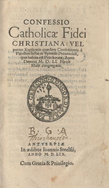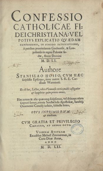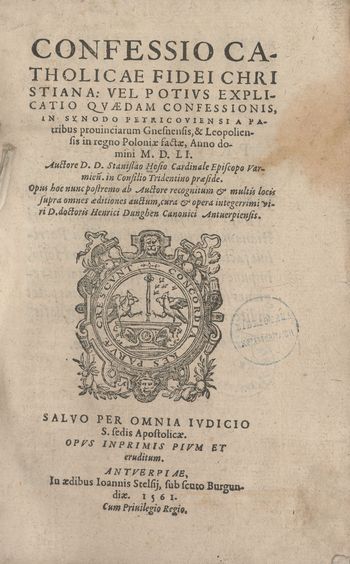 | Inne tytuły: | Confessio catholicae fidei Christiana vel potivs Explicatio qvaedam confessionis in synodo Petricoviensi a patribus prouinciarum Gnesnensis et Leopoliensis in regno Poloniae factae Anno Domini M.D.LI. authore Stanislao Hosio, cvm haec scripsisset episcopo, nunc autem S.R.E. cardinale Warmiensi [...], opvs imprimis pivm et eruditum Vel Potivs Explicatio Qvaedam Confessionis in Synodo Petricoviensi A Patribus provinnciarum Gnesnensis & Leopoliensis in regno Poloniae factae, Anno domini M. D. LI vel potivs Explicatio qvaedam Confessionis a Patribvs factae in Synodo Provinciali, qvae habita est Petricouiae, Anno Domini M. D. LI. Mense Maio congregatis |