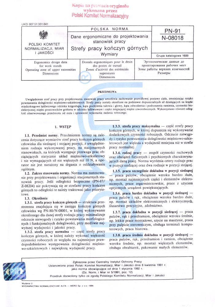 | Inne tytuły: | Ergonomics design data for work stands - Operating zone of upper extremities - Dimensions PN-N-08018: 1991 |