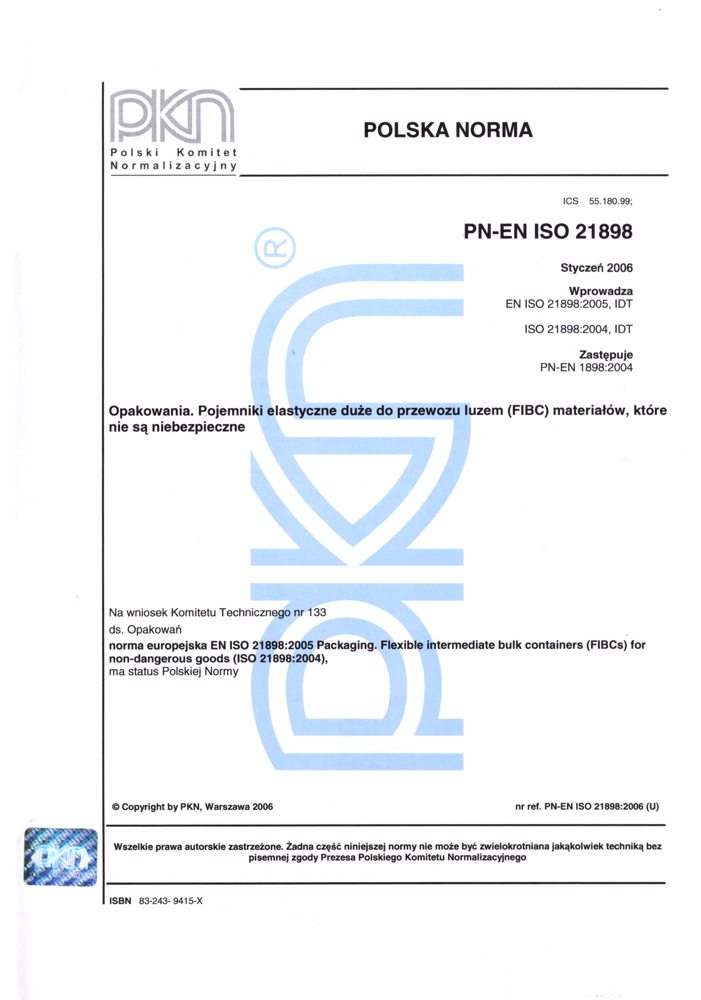 Opakowania. Pojemniki elastyczne duże do przewozu luzem (FIBC) materiałów, które nie są niebezpieczne PN-EN ISO 21898