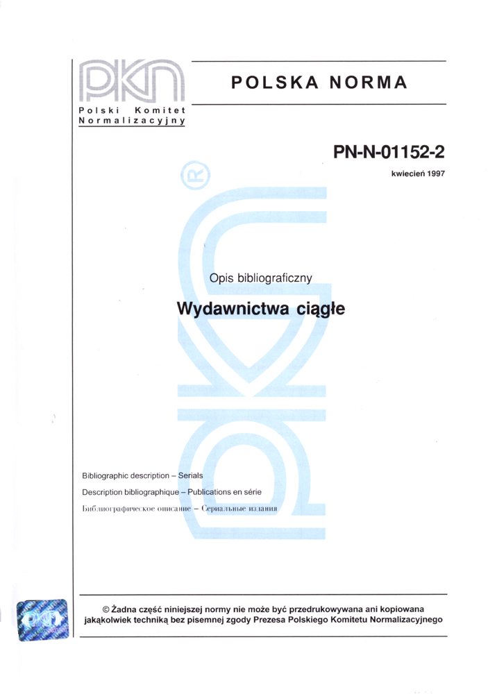 | Inne tytuły: | Bibliographic description - Serials PN-N-01152-2:1997 |