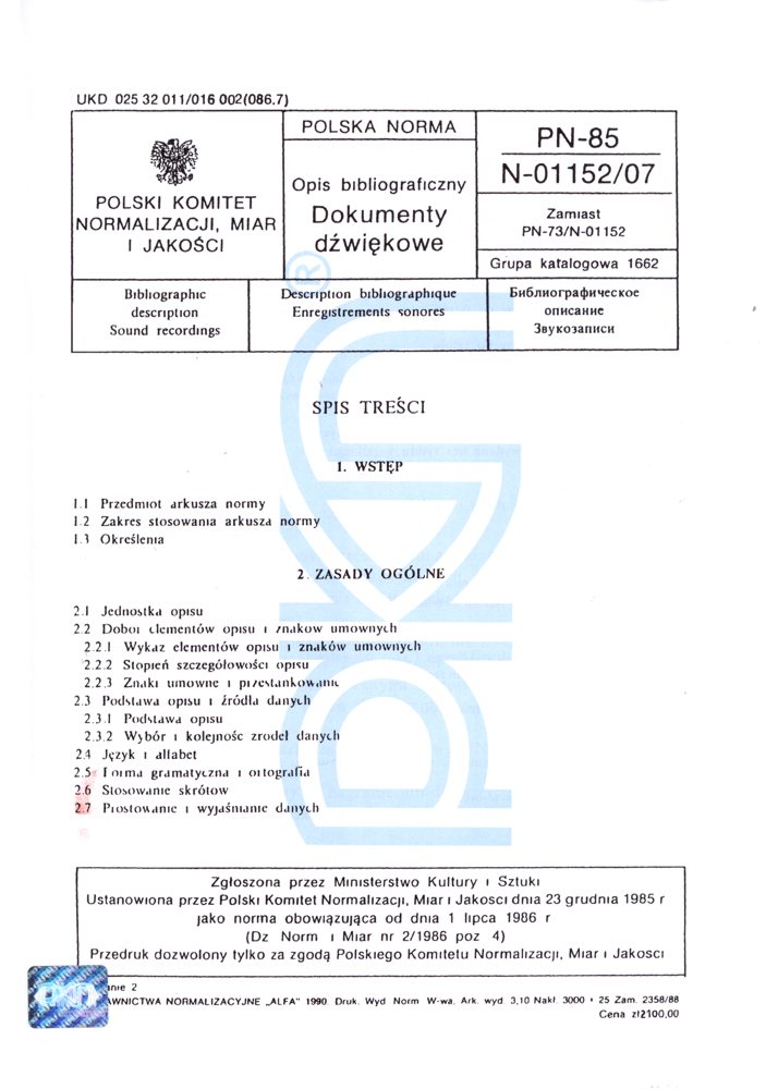 | Inne tytuły: | Bibliographic description - Sound recordings PN-N-01152-07: 1985 |