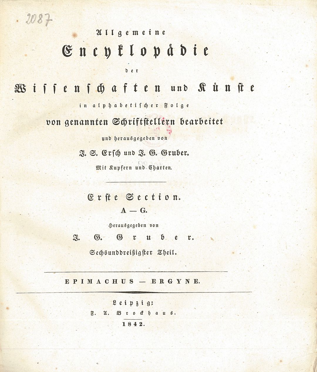 | Inne tytuły: | Allgemeine Encyclopädie der Wissenschaften und Künste Section 1, Epimachus-Ergyne |